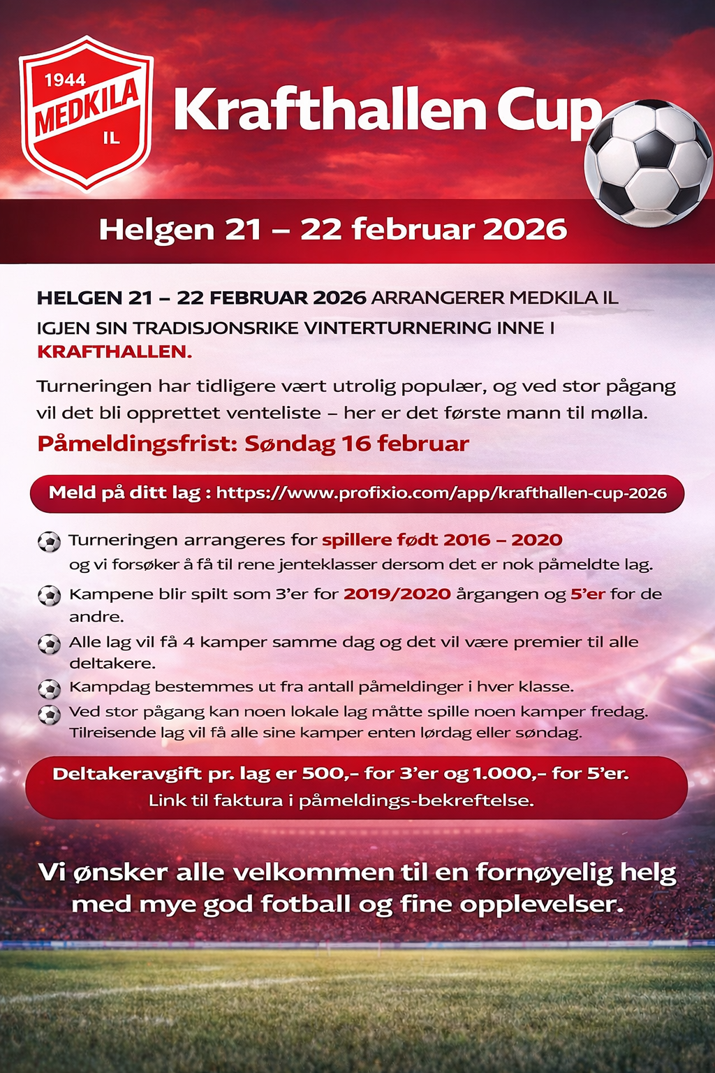 Helgen 21 – 22 februar 2026 arrangerer Medkila IL igjen sin tradisjonsrike vinterturnering inne i Krafthallen.
